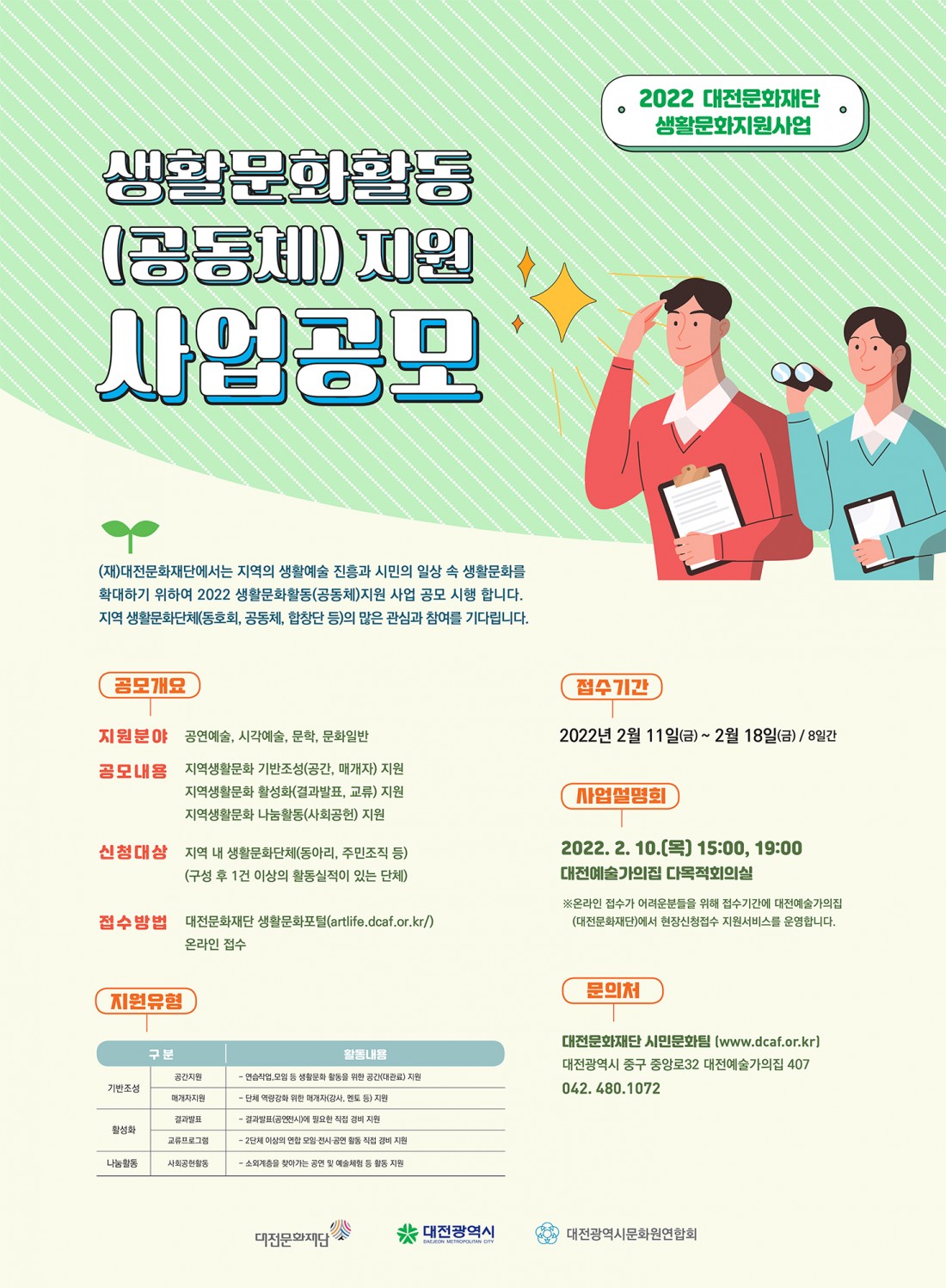 연합회소식 2022 생활문화활동(공동체)지원 사업공모 페이지 정보 작성자 최고관리자 작성일 22-02-07 09:55 조회 871 댓글 0 본문 (재)대전문화재단에서는 지역의 생활예술 진흥과 시민의 일상 속 생활문화를 확대하기 위하여 2022 생활문화활동(공동체)지원 사업 공모 시행합니다. 지역 생활문화단체(동호회, 공동체, 합창단 등)의 많은 관심과 참여를 기다립니다. 이전글 2022 중구작가 초대전/4.14~20/대전중구문화원 전시실 다음글 2021 어르신 문화프로그램 어르신을 위한 추억의 그 시절 그 쇼 댓글목록 0 등록된 댓글이 없습니다.
